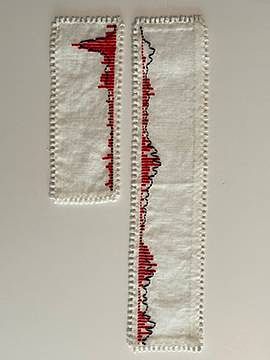 Doom Scrolls: 1918 v. 2020 is a visualization of death in a local community placed on the background of a shroud. There is a long tradition of ‘reading’ embroidered textiles for their meaning (Brodie, 2016; Damhorst, 1990 3 4 ). Made from entirely natural fibers, the scrolls are stitched in wool and linen on linen using yarn purchased from the Husflied (National Handicrafts Shops) in Oslo, Norway. The embroidery styles include cross and Holbein stitches taken from images of West Telemark artifacts (Norsk Institutt for Bunad og Folkedrakt, 2022 5 ) with a hemstitched Taggar border using the Hardanger style from Vestland (Stuland, 1960 6 ). The choice of Norwegian styles throughout was to reflect Dr Hustvedt’s ethnic heritage.